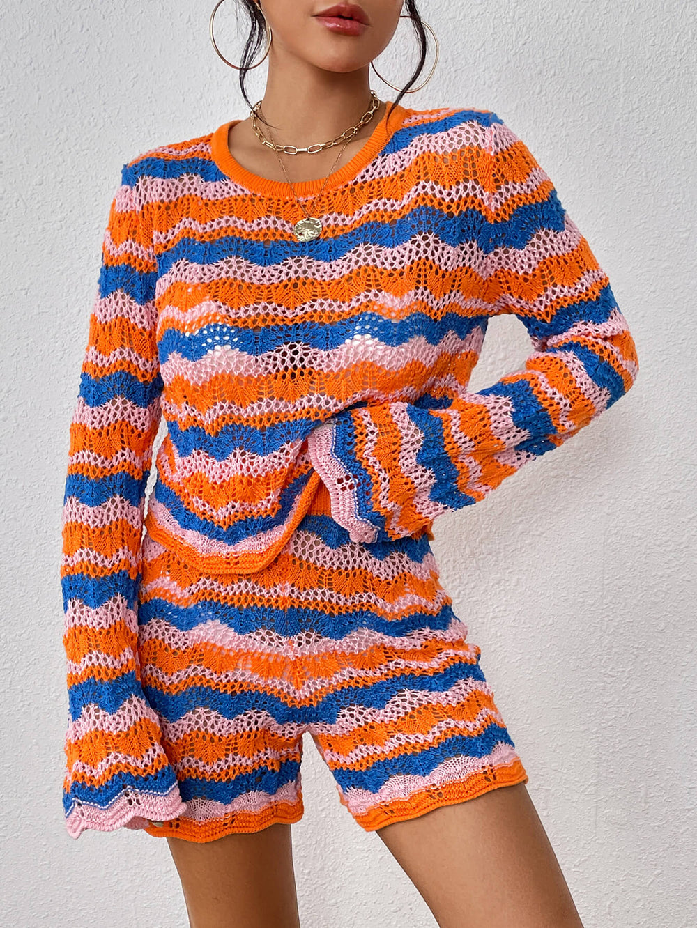 Embrace spring and summer style with our Cali Knit Crochet Matching Set. Made with lightweight fabric and intricate crochet details. this set is perfect for warm weather. Say goodbye to boring outfits and hello to effortless style. Get ready to turn heads and steal the show in this fabulous orange pink blue color block set.