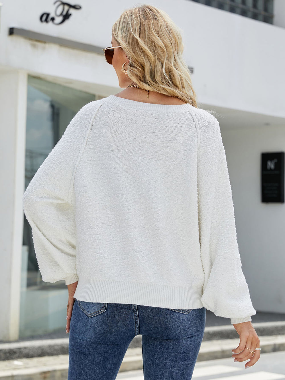 TheKnit sweater comes inoff white and fuzzy detail. As the saying goes. a sweater a day keeps the winter blues away. Liven up your mood in thissweater featuring a ribbed round neck. longballoon sleeves that pairs beautifully withour leathercombat boots.