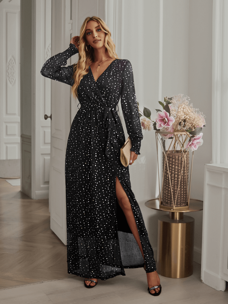 Demand attention in the Shimmer LeandraFront Split Maxi Dress inclassic black that features a low V neckline.