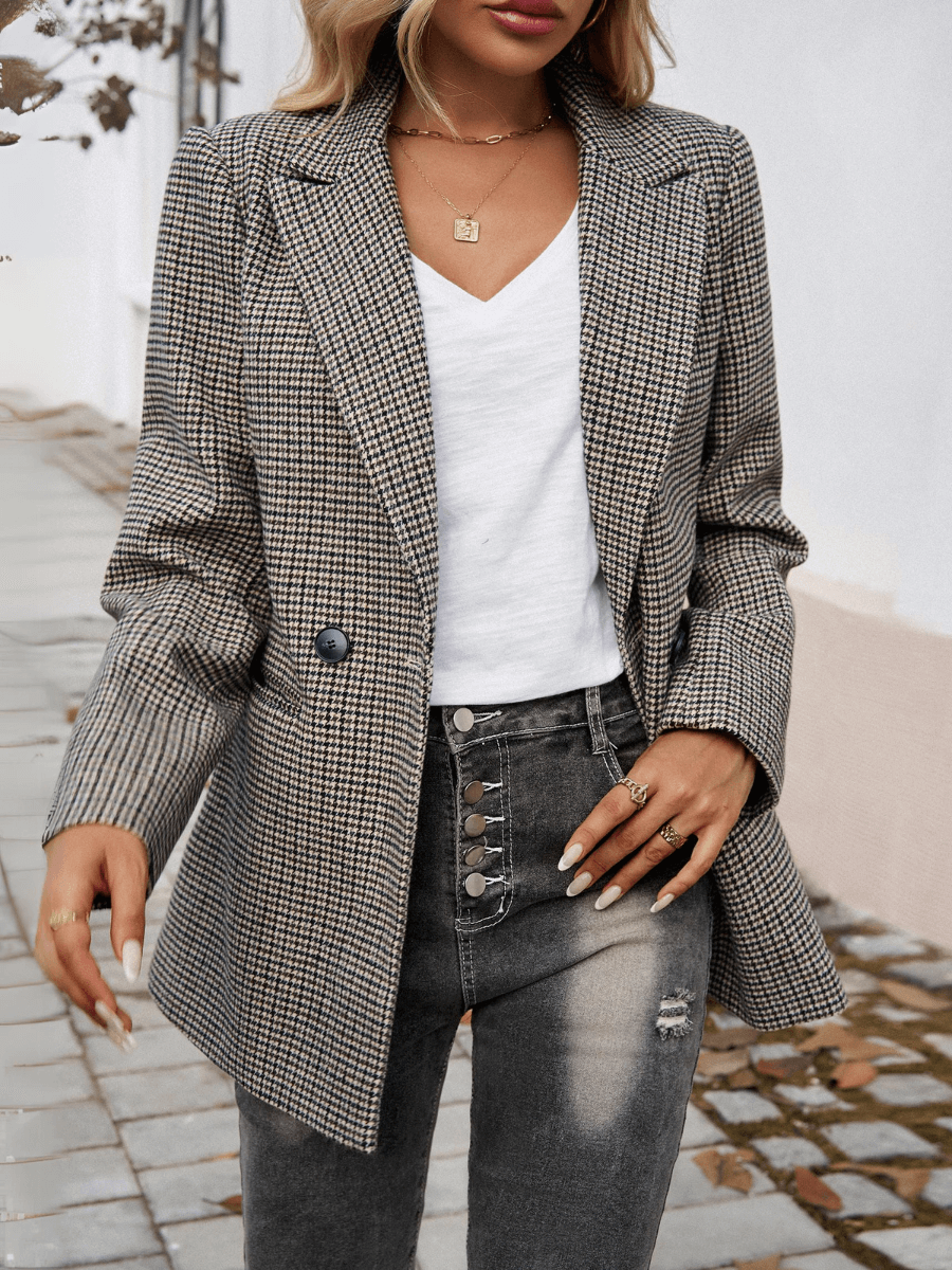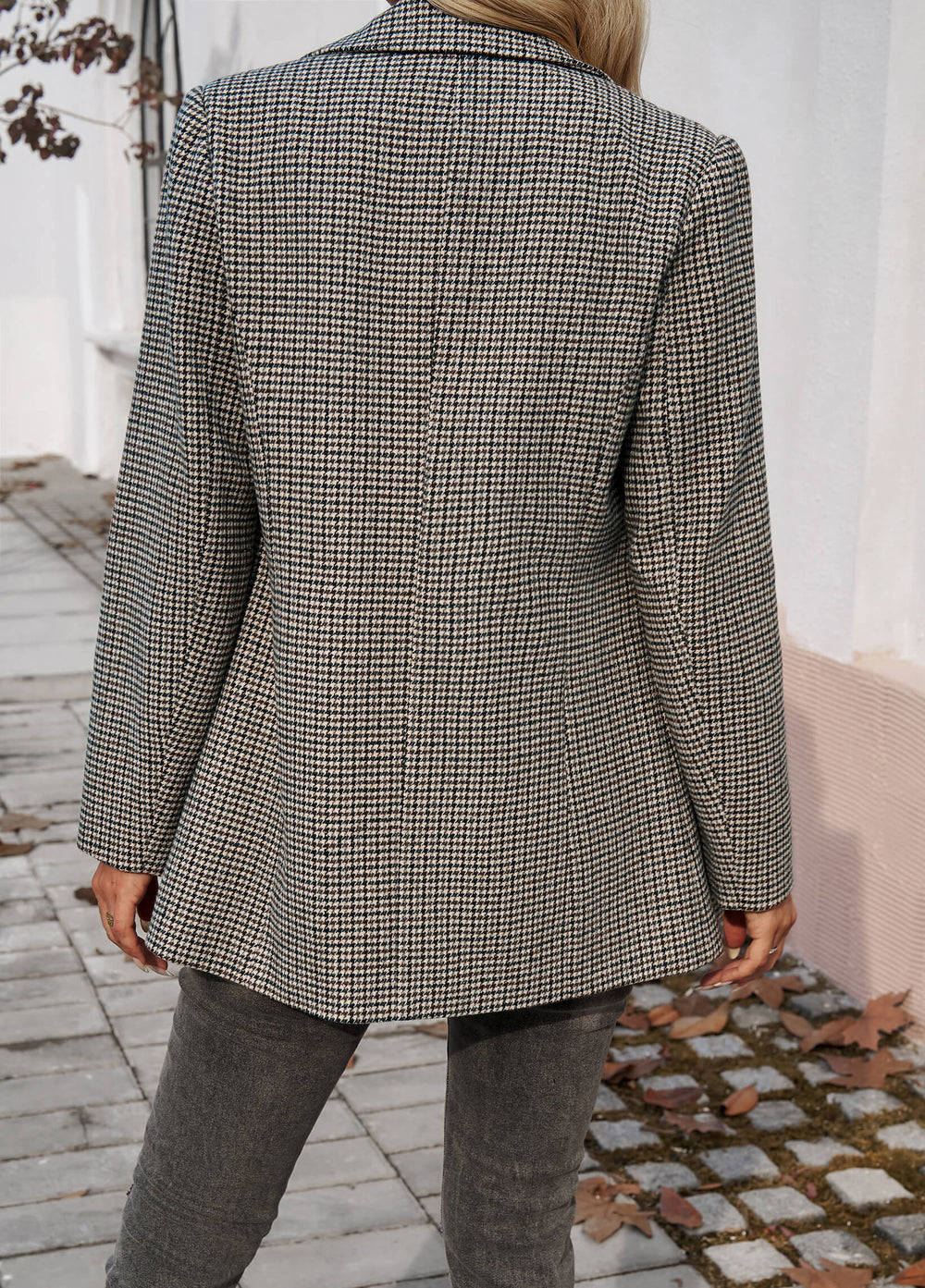 Look sharp and stylish in our Oxnard Pocketed Houndstooth Blazer. The pocketed houndstooth pattern adds a touch of sophistication to your look. With its tailored fit and convenient pockets. this blazer is both practical and fashionable. Elevate your outfit and make a statement with our Oxnard blazer.